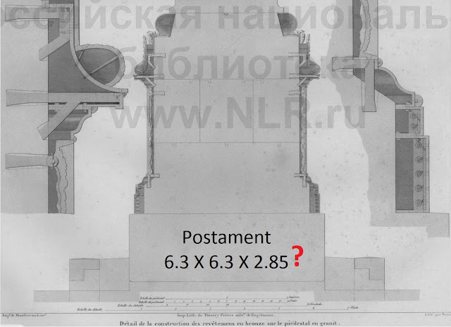Когда Монферран рисовал подъемную башню, то на всех его рисунках разные башни с несколькими вариантами количества горизонтальных перекладин. Нет двух одинаковых башен. А все 4 рисунка постамента до водружения на него колоны одинаковые и все дружно показывают одинаковый размер - 8-8,5 метров. Против 6.3 реальных. То есть, разница составляет почти 35% от 6.3 м. Почему он 5 раз нарисовал одинаковый неправильный постамент? Чтобы мы не подумали, что он один раз случайно ошибся. Хотя даже 1 раз ошибиться на 35% серьезному художнику невозможно. Я уж не говорю о таком титане как Монферран. С башней он не мог так поступить - нарисовать одинаково неправильную на нескольких рисунках, потому что мы не будем знать, какая была правильная. Башня - сооружение временное. Поэтому, чтобы показать фальсификацию, приходилось ее рисовать по-разному.